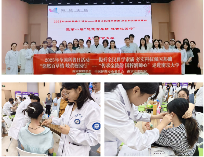 活动四:9月17日南京护理学会中医护理专业委员会组织委员12人在南京大学鼓楼校区举办以“悠悠百草情,岐黄校园行--传承金陵韵,国粹润师心”为主题的中医药科普活动。中医护理专家团队为老师们带来刮痧、拔罐、雷火灸、火龙罐、耳穴压豆等中医护理适宜技术,感受"外治疏通经络,内养调和气血"的中医智慧。活动现场为老师们免费检测血压、血糖、睡眠质量测评及个性化健康指导,实现精准健康科普服务。近60名教师参与此次活动。 望闻问切融科技,理法方药惠杏林。本次活动通过"科技赋能岐黄,国粹润泽师心"的创新实践,积极推动"传统与现代对话,人文与科技共舞"的中医药科普模式。专委会还将继续深挖厚植中医智慧,致力提升全民科学健康素养,为筑牢科技强国之根基持续赋能。