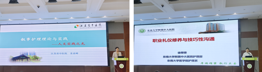 三、 学术讲座:理论引领,启迪思维 首场,由江苏省中医院姜素峰老师带来专题报告《叙事护理理论与实践-人文实践之光》。姜老师凭借其丰富的临床护理、健康管理、心理咨询及沙盘游戏经验,系统介绍了叙事护理的概念、独特的“3554四叶草模型”,深入探讨了叙事护理在临床人文实践中的落地应用,并展望其未来发展,为参会者点亮了人文关怀的一盏明灯。第二场讲座由徐翠荣主任带来《职业礼仪修养与技巧性沟通》,她从护理职业特点出发,详细讲解了礼仪修养的重要性以及与患者、同事进行有效沟通的技巧,提升了参会者的职业素养与人文服务能力。两场讲座内容精彩,理论与实践并重,深受好评。