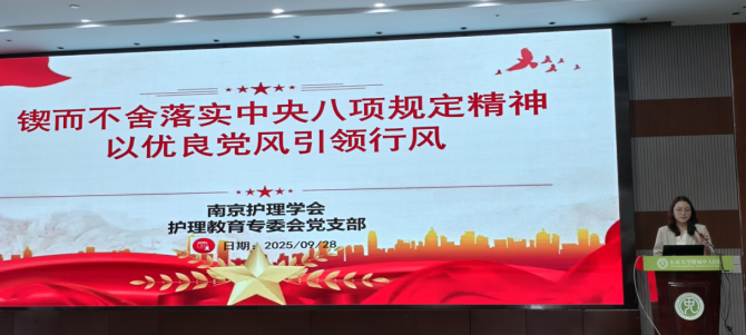 四、 党建活动:强化引领,端正行风 为强化思想政治引领,活动特别安排了党建专题学习。南京卫生高等职业技术学校护理学院副院长周丽荣教授作了题为《契而不舍落实中央八项规定精神—以优良党风引领行风》的讲座。周教授结合行业特点,强调了持续深化作风建设、以优良党风带动护理行风建设的重要性,引导广大护理教育工作者和管理者坚守初心、廉洁从业,为人文护理的深入实践提供坚强的政治和作风保障。
