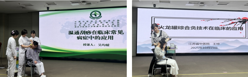 随后,江苏省中医院护士长王琼讲授了《火龙罐在临床常见病症中的应用及实操》。她结合丰富临床案例,详细介绍了火龙罐的功效、适应症与安全注意事项,深入讲解该技术在失眠、消化不良及关节痹痛等病症中的具体应用,强调操作前需评估患者体质与局部皮肤状况,操作中需精准控制罐体温度与移动速度。在实操演示中,王琼护士长重点展示了揉、碾、推、按、熨、烫等经典手法,通过“温、通、调、补”四效合一的作用,达到调理脏腑、疏通经络的效果。学员们认真观察操作细节,积极提问,现场互动热烈。