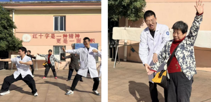 中医健身操指导区精准契合居民健康需求。护理骨干精选动作舒缓、易于掌握的八段锦进行现场教学,从“起势”到“收势”逐式讲解动作要领,并同步示范呼吸配合技巧。居民们自发列队跟随练习,现场气氛热烈融洽。不少居民表示:“跟着专业老师学感觉很安心,学会后还能带着家人一起练,受益匪浅。”