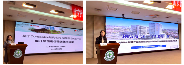 专题报告结束后,随即进入优秀护理案例展示环节,选取专委会2025年《进一步改善护理服务》优秀案例竞赛两个示范案例做现场汇报,该环节由中西医结合护理专委会委员、江苏省第二中医院高雪琴科护士长主持。首先是江苏省中医院急诊科护士长吴艳红展示优秀案例《基于Donabedian结构-过程-结果理论质量评价提升急性创伤患者救治效率》。该案例紧扣临床痛点,以创新思维构建创伤护理新框架。由于创伤救治具有病情急、进展快、复杂度高等特点,已成为医疗领域的重点攻坚方向。吴艳红护士长提出了创伤护理方案质量改进专项项目,通过创新机制、优化流程、强化培训,实现了创伤护理质量与救治效率的双重提升,有效解决了职责分工模糊、团队协作不畅、抢救时间评价单一等痛点问题。 随后来自江苏省中西医结合医院重症监护室护士长成晶晶展示优秀案例《预防有法,护理有道——4321结构化护理干预在重症患者失禁性皮炎皮肤管理中的临床应用》。失禁性皮炎在住院患者中具有较高的发生率,给患者、护士及医院带来了诸多不利影响,因此降低其发生率至关重要。本案例聚焦于重症患者失禁性皮炎的护理,详细介绍了从背景调研、计划制定到具体实施的全过程及其取得的成效,构建了预防、治疗、康复一体化的管理模式,实现了皮肤管理的关口前移。通过中西医结合的方式,开辟了新的治疗路径,充分展现了中西医结合与结构化管理的独特优势。两位护士长的精彩案例展示,为参会人员提供了深度的思考空间和宝贵的学术启示。