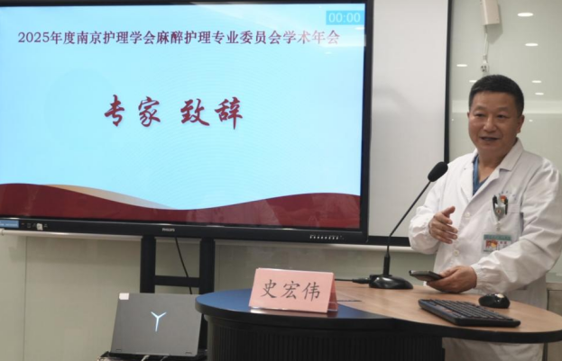 开幕式上,南京市第一医院麻醉疼痛与围术期医学科科主任史宏伟致辞。他对南京护理学会搭建的宝贵平台、各医院的通力支持以及会务组的细致筹备表示诚挚感谢,并对各位委员和同仁的到来致以热烈欢迎。他指出,麻醉护理肩负保障围术期患者安全的重要使命,期望大家通过交流提升能力,在实践中锤炼本领,共同推动麻醉护理事业迈向新的高度。最后,他勉励大家在专业道路上不断精进,并预祝大会圆满成功。