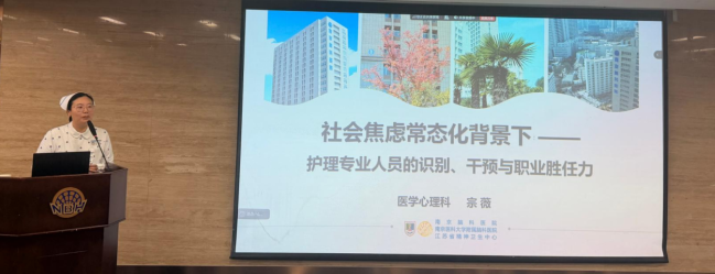 南京脑科医院医学心理科护士长宗薇以《社会焦虑常态化背景下——护理专业人员的识别、干预与职业胜任力》为题,开启了一场深刻而富有温度的主题分享。她指出,当前社会焦虑呈现“年轻化、常态化、躯体化”趋势,焦虑已成为一种“时代的底色”。护理人员作为与患者接触最密切的专业群体,既是情绪的“第一发现者”,也是心理支持的“第一道防线”。她通过焦虑的临床表现与躯体化特征、认知行为干预的实用技巧等内容,系统阐述了护理人员如何在日常工作中精准识别、科学干预、有效支持。她以“用心倾听,用爱守护”寄语与会者,鼓励大家在喧嚣中辨认自己的声音,在照护中保持共情与觉察。